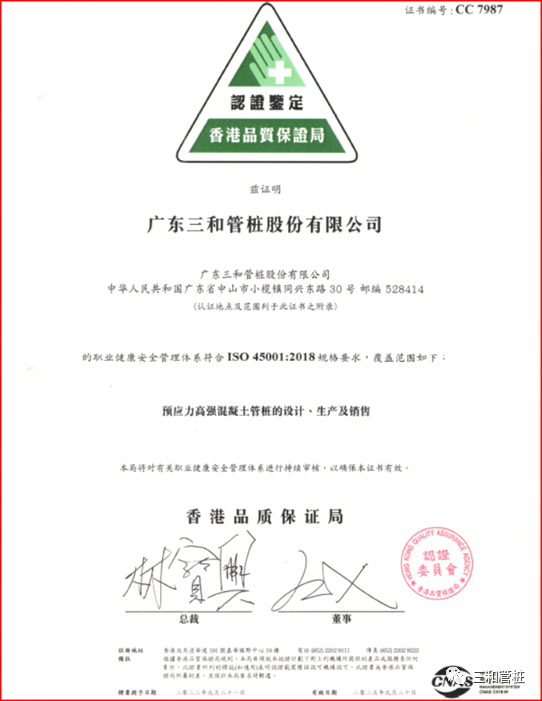 2022年10月11日,公司收到香港品质保证局颁发的三体系(ISO9001:2015、ISO14001:2015、ISO45001:2018)认证证书,标志着我司的经营能力和管理水平再上新台阶。