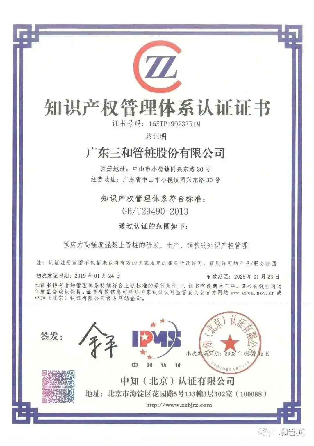 此外,因公司地址由东升镇变更为小榄镇,知识产权管理体系认证证书经营地址及注册地址相应申请变更,已于近日收到中知(北京)认证有限公司颁发的认证证书(165IP190237R1M)。