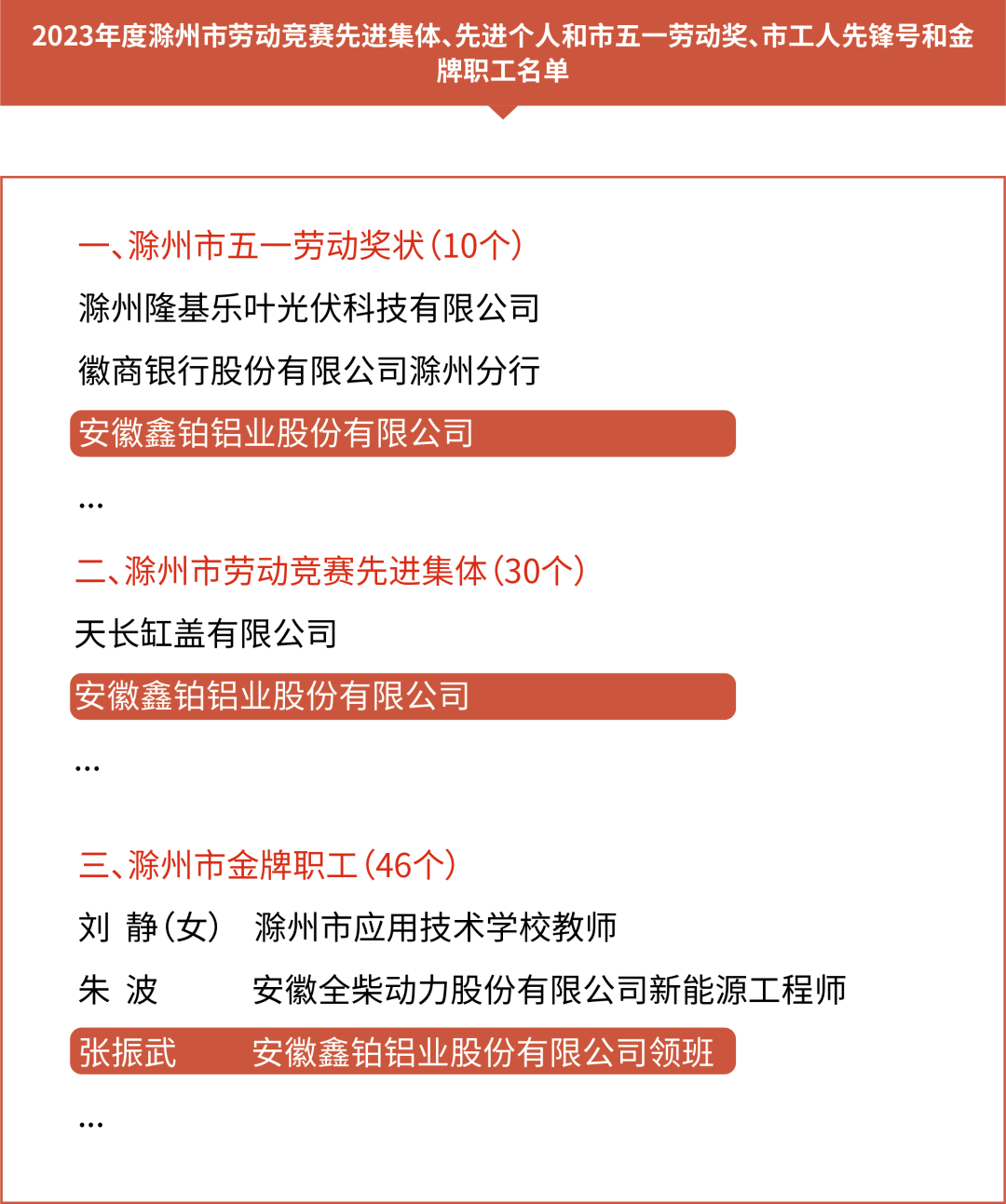 在第134个“五一”国际劳动节来临之际,滁州市劳动竞赛委员会、滁州市总工会表彰了一批建功争先,助推发展见效,为滁州经济社会高质量发展作出了积极贡献的先进集体和先进个人,其中鑫铂股份荣获“滁州市五一劳动奖状”、“滁州市劳动竞赛先进集体”荣誉称号,公司员工张振武荣获“滁州市金牌职工”荣誉称号。