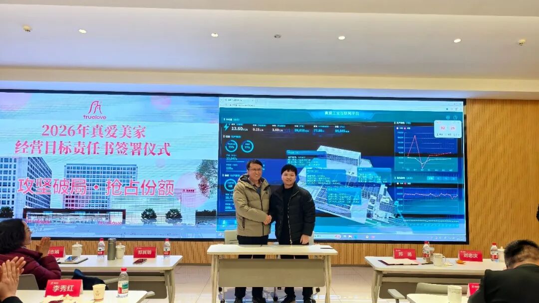 蓝图已绘就,责任勇担当;目标已明确,实干创未来。为确保2026年公司经营目标落地生根、层层压实,大会进入重磅环节——2026年公司经营目标责任书签约仪式。真爱集团总裁郑扬与真爱美家股份有限公司总经理郑其明上台,共同签署2026年公司经营目标责任书。一纸责任书,承载的是责任与使命,彰显的是决心与担当,更是公司上下全力以赴“攻坚破局·抢占份额”的郑重承诺。