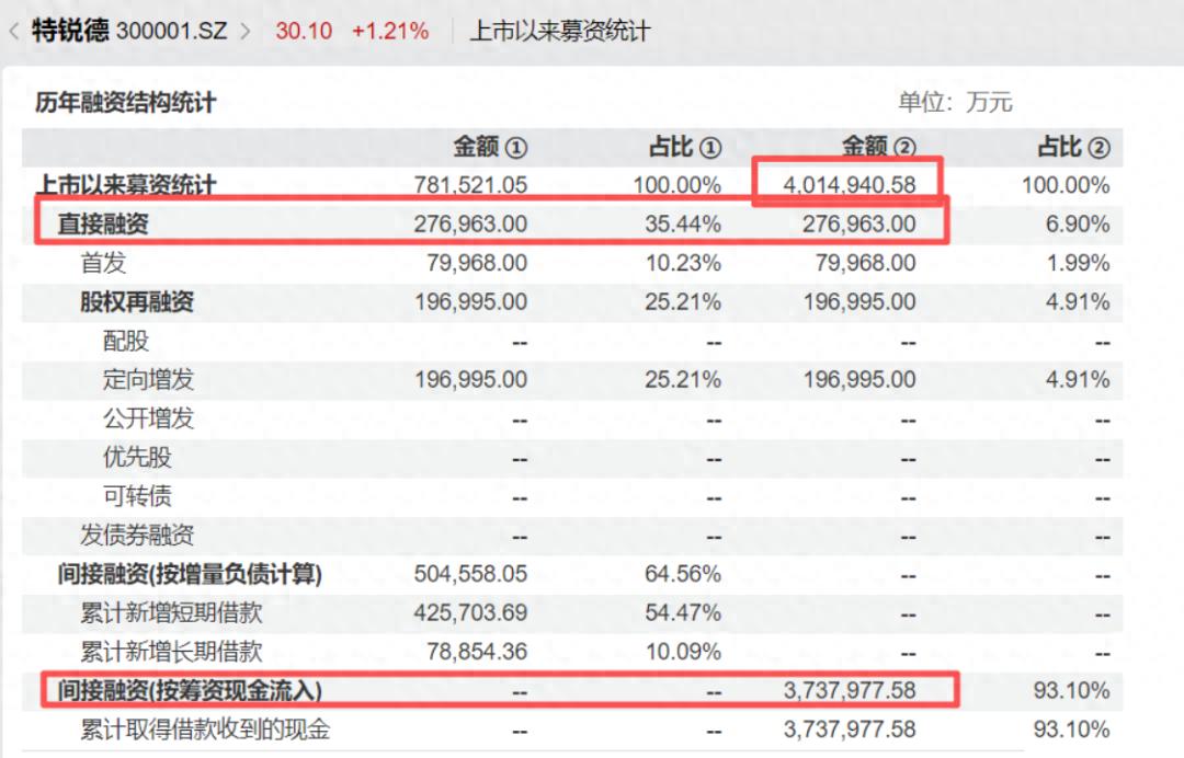 直接融资中,特锐德于2009年10月登陆A股时,首发募资净额为7.79亿元。截至3月4日收盘,特锐德A股报收30.12元/股,市值317.93亿元。