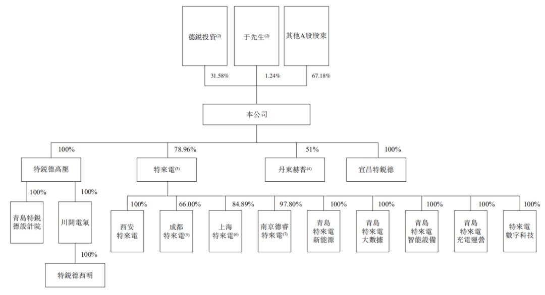 递表前,特锐德单一最大股东组别为德锐投资、于德翔,二者分别持有公司31.58%、1.24%股份。其中,德锐投资由于德翔持有69.27%。因此,于德翔通过直接及间接方式合计控制公司32.82%股份。