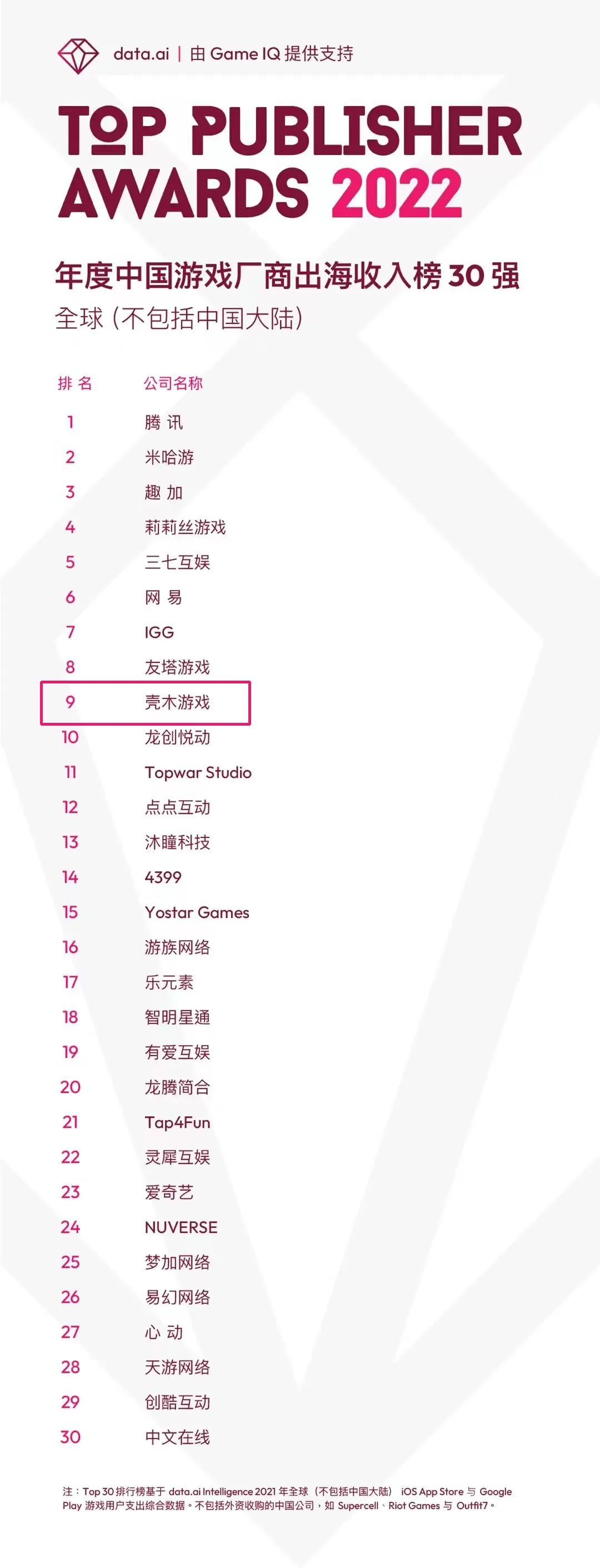 近日,data.ai发布了年度中国游戏厂商出海收入30强榜单。其中,神州泰岳旗下手游团队——壳木游戏上榜第九名。