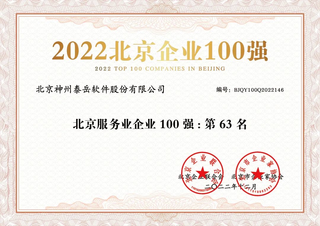 近日,北京企业联合会、北京市企业家协会发布了“2022北京服务业企业100强”榜单,神州泰岳凭实力荣登北京服务业企业100强榜单第63名。