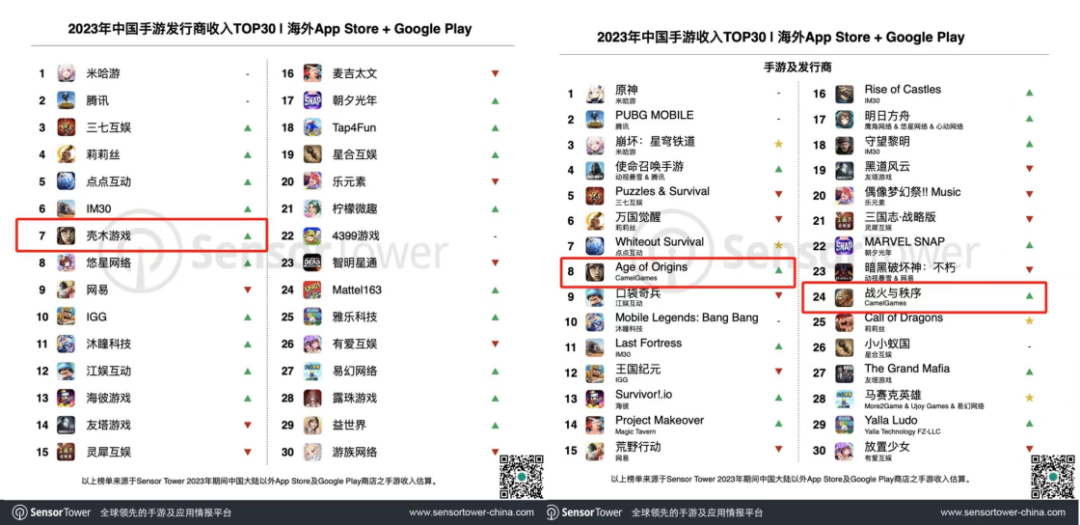 同年,壳木游戏也入围“2023年度中国手游发行商收入排行版”并位列第七,甚至高于网易以及因字节260亿收购而一战成名的沐瞳科技。