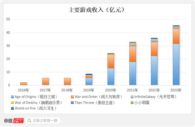2023年,两款游戏的累计充值流水均达到10亿美元级,分别位列“2023年度中国手游收入榜”第8位和第24位,合计贡献营收42.89亿,占到游戏收入的9成以上,其中海外市场收入占比近9成。
