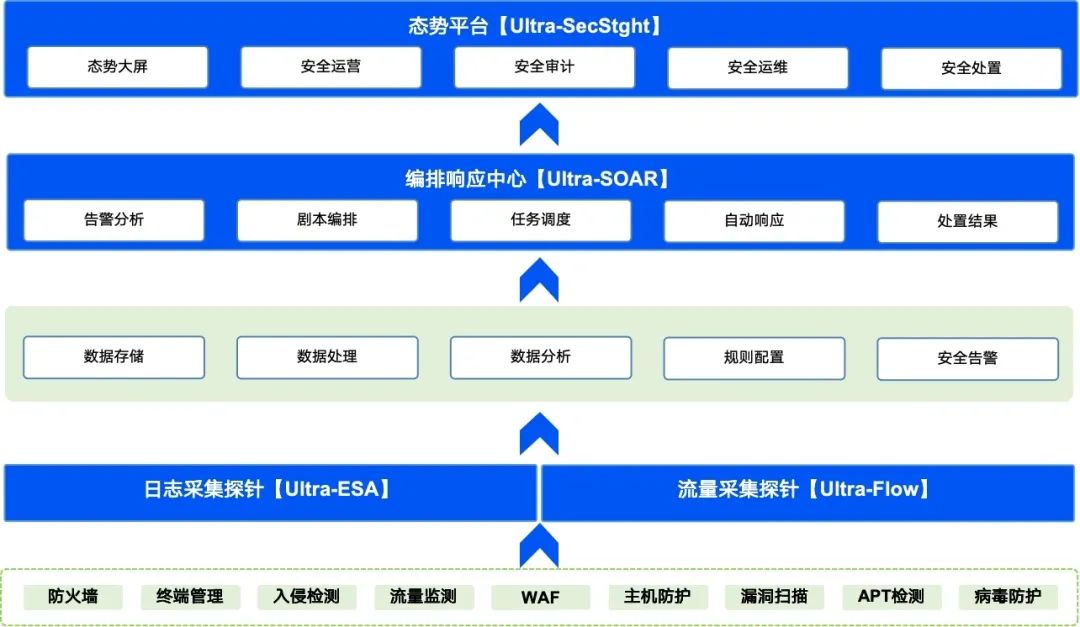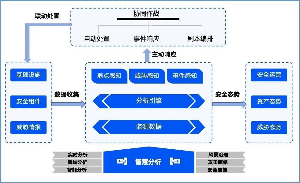 安全管理与态势分析平台采用了先进的大数据架构,通过主动采集和被动接收的方式,采集获取网络安全态势感知平台所需的各类安全数据、流量数据、主机数据、资产数据和情报数据,再利用规则分析、关联分析、统计分析、机器学习等方法对海量数据进行多维分析,从而实现对企业网络安全态势的实时监测,精准识别企业面临的威胁。