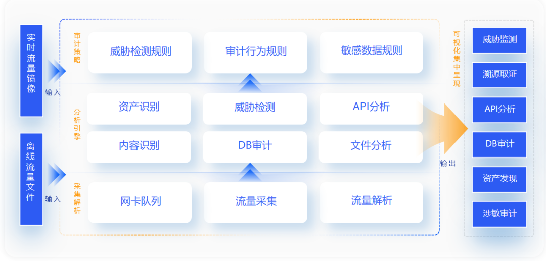 全流量监测审计系统通过对网络数据的实时全量采集、协议还原解析、攻击威胁监测,并分析网络的流量资产、连接对象及数据内容来监控异常行为和安全风险,最终实现“流量可视、威胁可控、溯源可追、审计可查、风险可知”的系统目标。