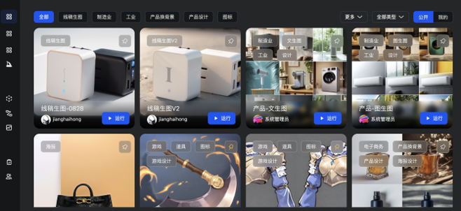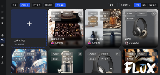 通过预置和自定义的工作流,帮助用户快速实现多样化任务,如产品材质迁移、线稿生成、产品换背景、产品海报生成、电商AI模特等。