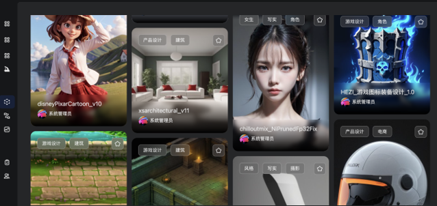 支持基础模型、Lora模型、ControlNet模型等的集中管理,可按项目授权使用,还支持本地上传及Civitai、Huggingface链接上传模型。