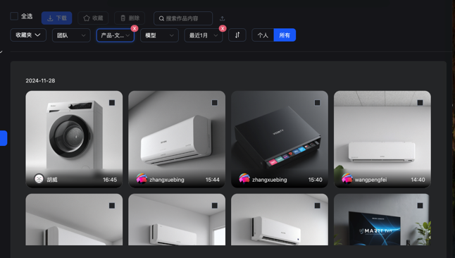 支持多项选择、一键全选功能,便于批量操作;提供收藏、删除,特别是文搜图和图搜图等实用功能;根据应用、日期范围以及所属团队对作品进行分类整理,帮助用户快速定位目标内容。