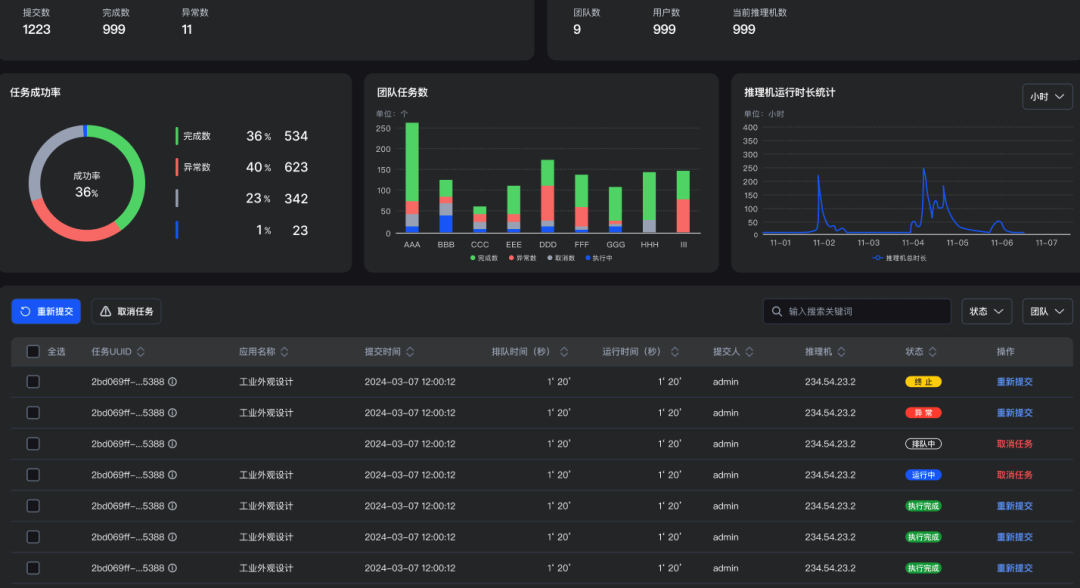 提供系统整体运行情况、任务成功率、推理机运行时长等可视化数据分析,助力企业优化成本、提升效率。