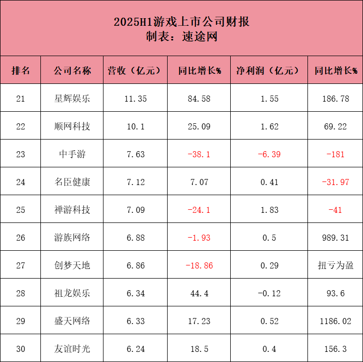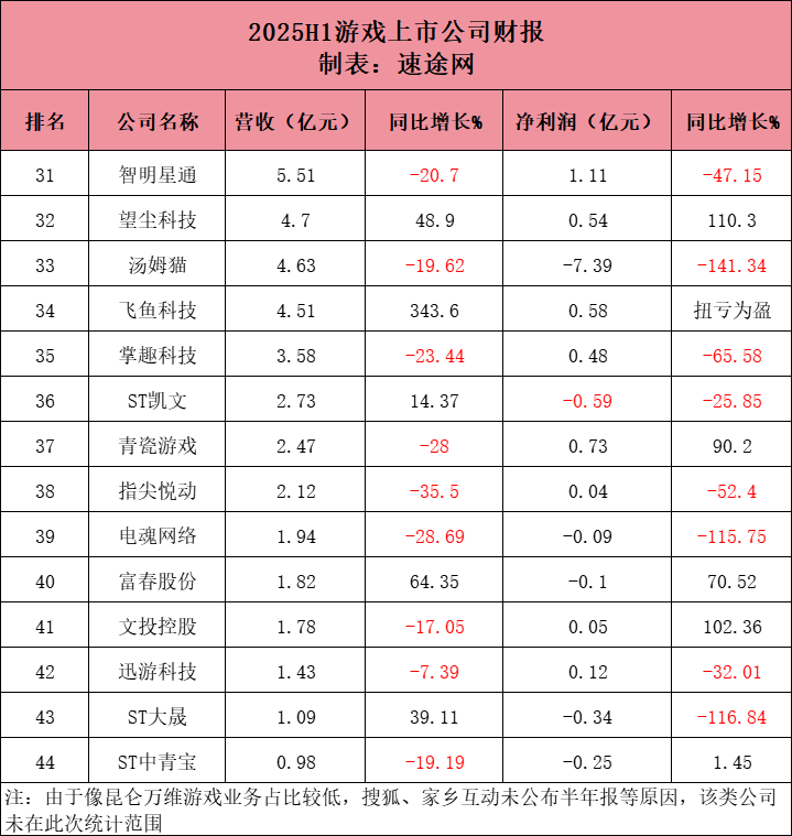 据速途网不完全统计,已发布半年报的44家游戏上市公司中(含A股、港股及美股中概股),营收同比增长的占23家,21家出现营收下滑;净利润增速也是差异显著,其中16家出现净利润大幅下滑,7家游戏上市公司实现扭亏为盈,游戏行业上半年整体业绩向好。