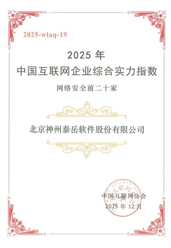 近日,中国互联网协会举办的《中国互联网企业综合实力指数(2025)》发布会圆满落幕,神州泰岳凭借身份安全的深厚积累、安全大模型的创新突破及安全运营的技术优势,成功跻身“2025年中国网络安全前二十家企业”榜单,彰显了其在网络信息安全领域的行业认可度与卓越创新力。