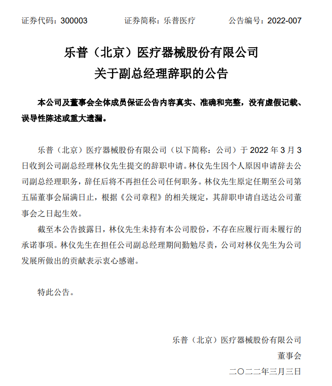 近日,从乐普医疗公告获悉,其副总经理林仪,近日因个人原因辞去副总经理职务,并不再担任公司任何职务。