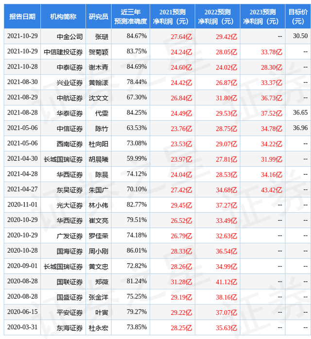 证券之星数据中心根据近三年发布的研报数据计算,国海证券周小刚研究员团队对该股研究较为深入,近三年预测准确度均值高达86.01%,其预测2021年度归属净利润为盈利28.33亿,根据现价换算的预测PE为10.5。