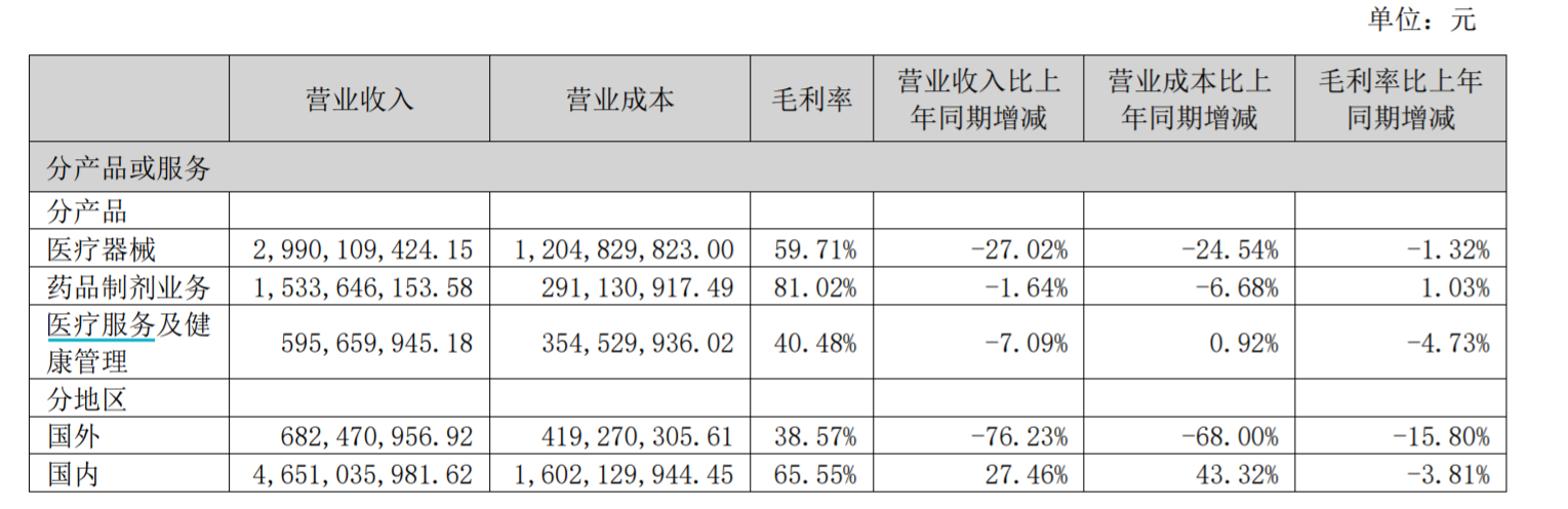 其中,医疗器械是公司营业收入占比最大板块,上半年实现营业收入29.90亿元,同比下降27.02%。