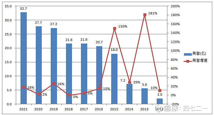 以商誉数据来看,2021年商誉账面余额32.73亿,占总资产的比重16%,商誉减值准备1.63亿。形成商誉的并购一共31家公司,并购为公司贡献了不少增长。这些年的商誉账面价值及增速,见下图。并购带来的增长,成色没有内生性增长好。