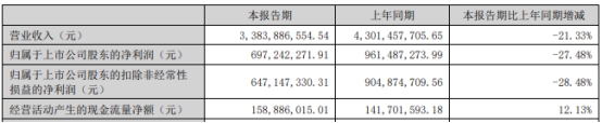 乐普医疗上周五(8月23日)晚间披露的2024年半年度报告显示,公司上半年实现营业收入33.84亿元,同比下降21.33%;归属于上市公司股东的净利润6.97亿元,同比下降27.48%;归属于上市公司股东的扣除非经常性损益的净利润6.47亿元,同比下降28.48%;经营活动产生的现金流量净额1.59亿元,同比增长12.13%。