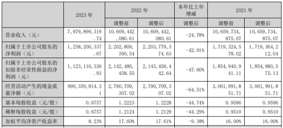 2023年,乐普医疗实现营业收入79.80亿元,同比下降24.78%;归属于上市公司股东的净利润12.58亿元,同比下降42.91%;归属于上市公司股东的扣除非经常性损益的净利润11.23亿元,同比下降47.60%;经营活动产生的现金流量净额9.90亿元,同比下降64.51%。