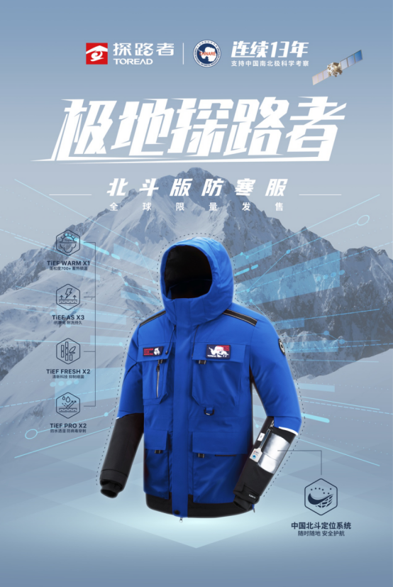中国自有科技的加持为国货的高品质升级提供了强大助力,此次极地探路者北斗版防寒服全球限量发售,在为消费者提供极致守护的同时,也彰显了中国企业的民族自信和国货自信。