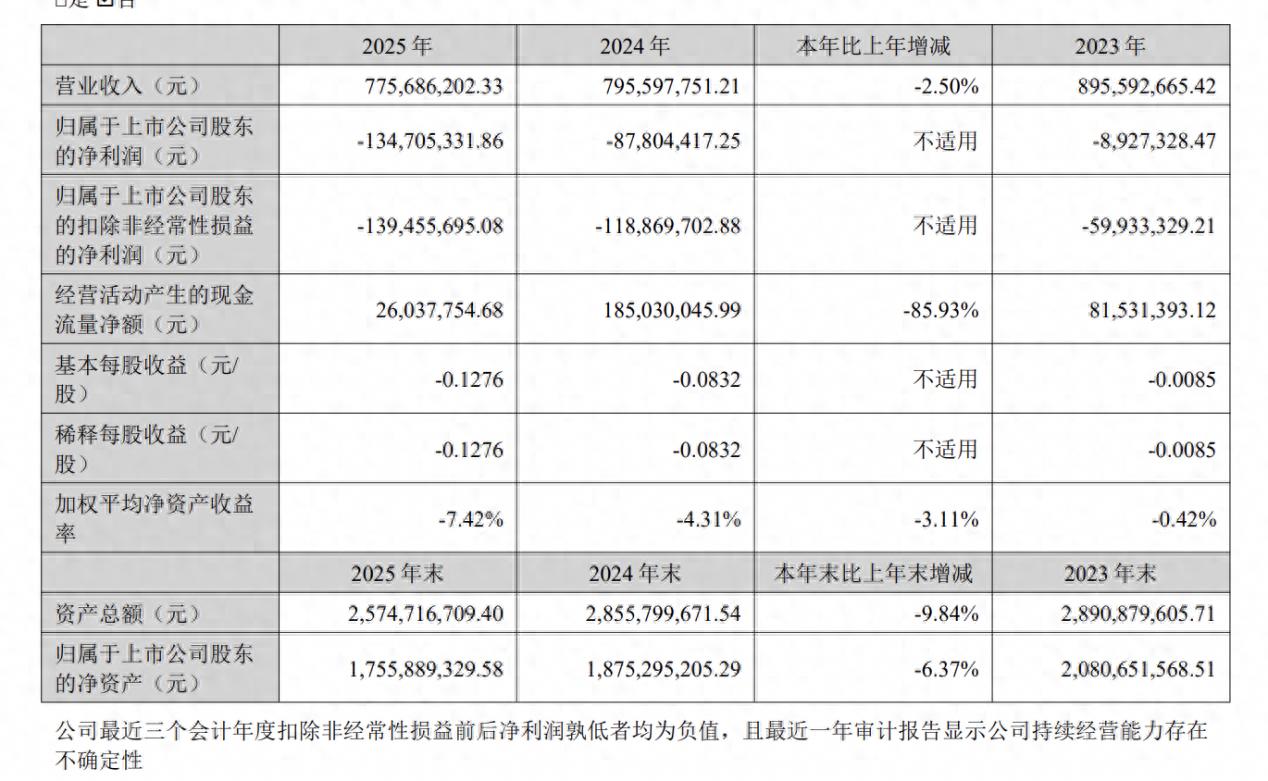 2025年,莱美药业营业收入为7.76亿元,同比下降2.5%;归属于上市公司股东的净亏损1.35亿元,上年同期亏损0.88亿元;归属于上市公司股东的扣除非经常性损益的净亏损1.39亿元,上年同期亏损1.19亿元。
