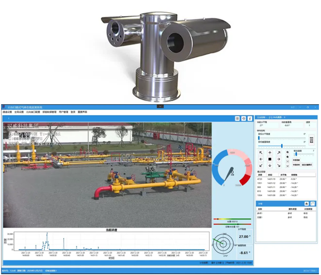 云台扫描式激光气体在线监测系统基于TDLAS技术,只对目标气体有反应,可对燃气厂站进行24小时不间断无人值守的连续监测,最大监测半径可达100米,隔爆型云台可360°水平连续旋转,±90°垂直旋转。一旦检测到燃气泄漏,可迅速将泄漏站点的报警时间、位置信息、浓度信息、云台角度信息同步叠加到监控视频上,同时红外摄像机将进行紧急拍照、录像,并保存到数据交换中心的紧急报警数据区域,便于及时进行现场处置,以及后期查询、回放。