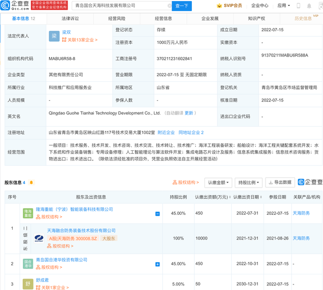 近日,青岛国合天海科技发展有限公司成立,法定代表人为梁双,注册资本1000万元人民币,经营范围包含:海洋工程装备研发;海洋工程关键配套系统开发;人工智能理论与算法软件开发;集成电路芯片设计及服务等。该公司由天海防务(300008)全资子公司隆海重能(宁波)智能装备科技有限公司等共同持股。
