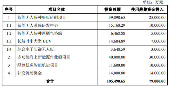 据天海防务2023年8月26日披露的2022年度向特定对象发行股票预案(修订稿)显示,本次向特定对象发行募集资金总额不超过人民币79,000.00万元(含本数),扣除发行费用后的募集资金净额将用于以下项目:智能无人特种船艇研制项目、多功能海上新能源作业船项目、绿色低碳智能航运项目和补充流动资金。