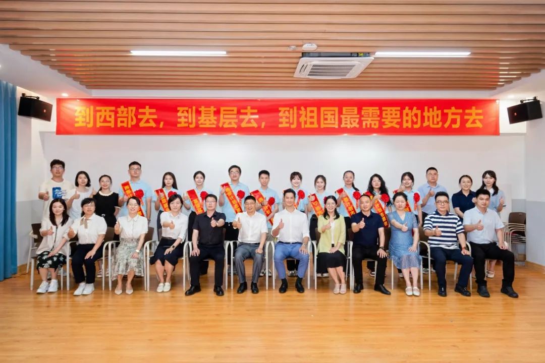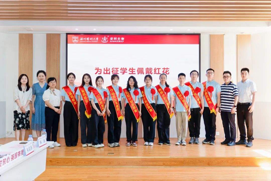 会上,温医大相关部门负责人介绍了学校研究生支教团、西部计划工作以及“安科梦想”基层就业奖学金实施情况,并对志愿到祖国西部、基层建功立业的优秀毕业生进行了表彰。周大为先生与学校老师们为即将出征的同学披绶带、戴红花、赠送出征行囊。