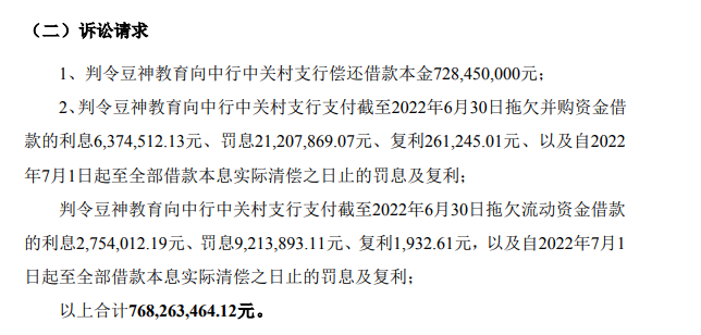 此次合同纠纷起源于去年。2021年6月24日,豆神教育与中行中关村支行签署《授信额度协议》,同年6月29日,豆神教育在《授信额度协议》项下共计贷款7.28亿元。然而,履约期间豆神教育未能按期、足额支付利息;原实际控制人池燕明还被列为失信被执行人并被限制高消费,触发了协议所约定的违约事件,中行中关村支行因此宣布贷款提前到期。