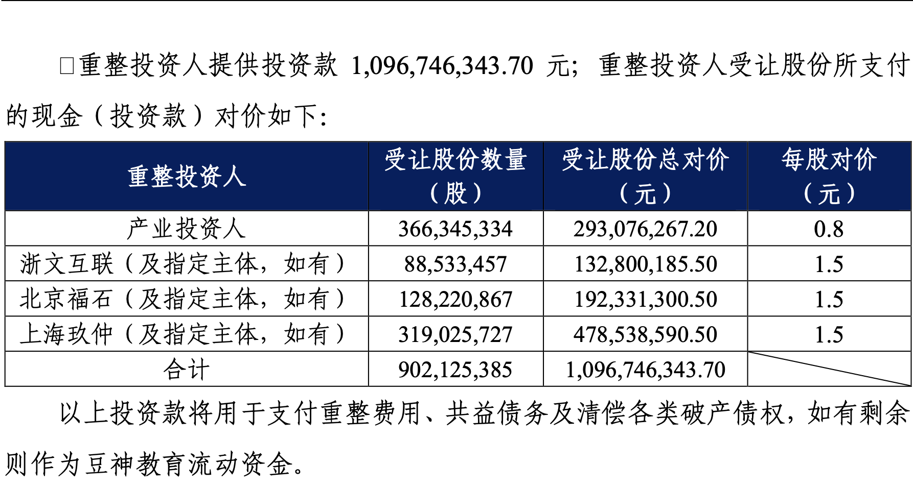 去年11月29日,豆神教育发布的《关于签署预重整及重整投资协议进展暨调减重整投资人受让股份数量及对价的公告》,浙文互联原受让股份数量96666668股,原受让股份总对价1.45000002亿元;调减后受让股份数量88533457股,调减后受让股份总对价1.328001855亿元,调减数量8133211股,受让股份每股价格1.5元/股。