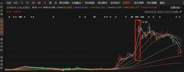 但11月4日起,行情由强转弱,豆神教育开启了下跌之路,如今股价已跌回7元内。截至12月27日收盘报6.24元/股,涨幅0.81%,较11月初的高点回撤超50%,但仍处在2021年以来的高位区间。