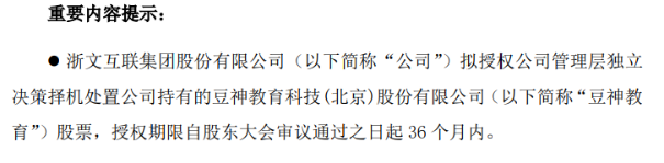 限售股尚未解禁,浙文互联就先一步宣布了减持计划。12月11日,浙文互联公告称,拟择机处置公司持有的豆神教育股票,交易时间为股东大会审议通过之日起36个月内,交易方式为集中竞价或大宗交易。