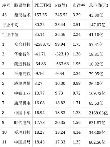 从行业市盈率排名来看,公司所处的交运设备行业市盈率平均30.22倍,行业中值35.14倍,鼎汉技术排名第43位。