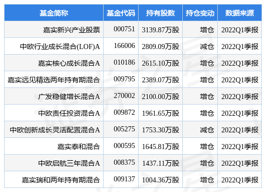 根据2022Q1季报基金重仓股数据,重仓该股的基金共56家,其中持有数量最多的基金为嘉实新兴产业股票。嘉实新兴产业股票目前规模为81.04亿元,最新净值3.589(4月27日),较上一交易日上涨4.45%,近一年下跌34.29%。该基金现任基金经理为归凯。归凯在任的公募基金包括:嘉实泰和混合,管理时间为2016年3月10日至今,期间收益率为94.55%;嘉实增长混合,管理时间为2018年12月4日至今,期间收益率为74.68%;嘉实瑞和两年持有期混合,管理时间为2020年4月9日至今,期间收益率为-5.75%。