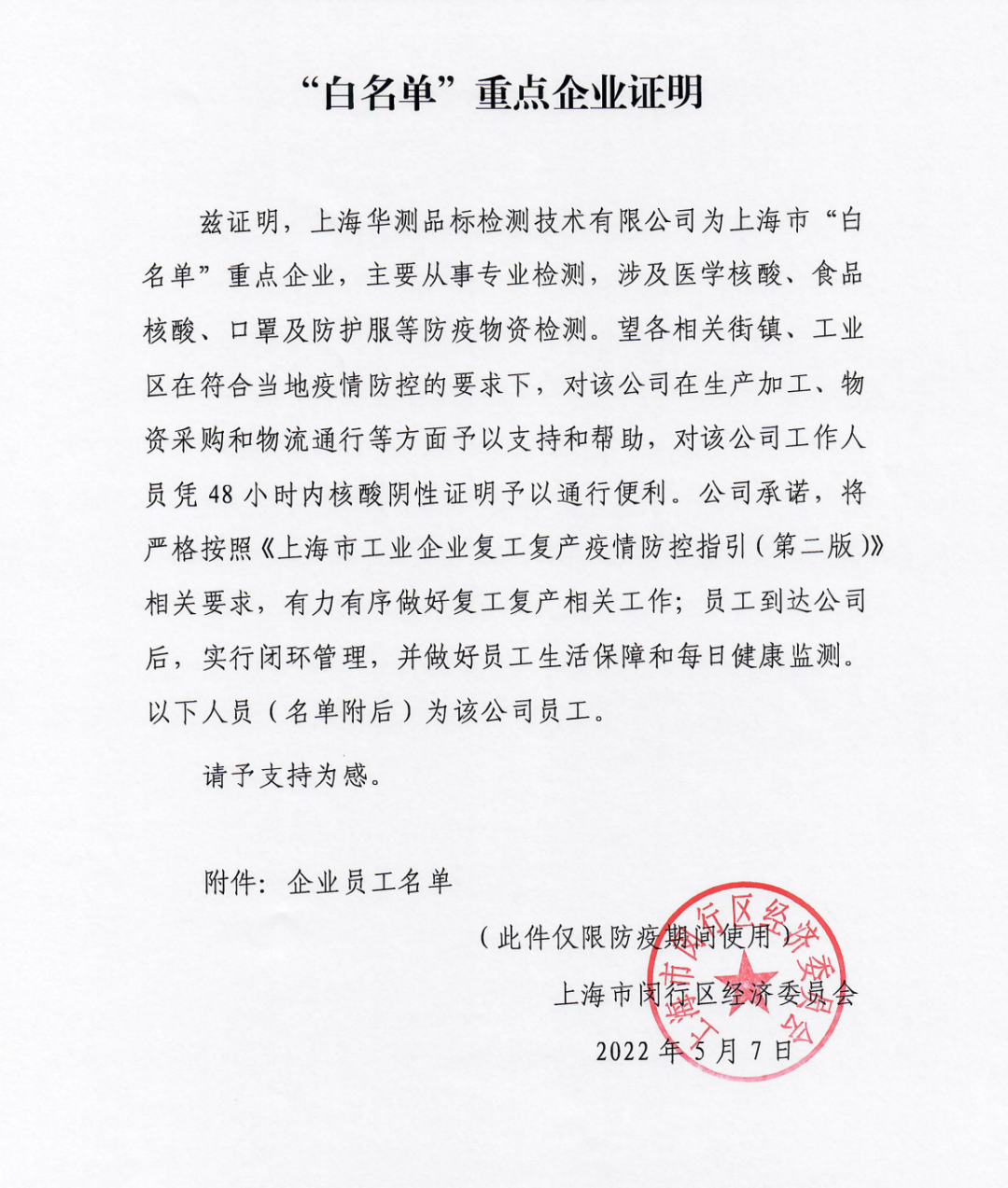 随着上海疫情防控形势持续向好,当前上海企业复工复产也在紧锣密鼓的进行着。CTI华测检测上海公司于5月初已正式获得上海市闵行区经委的商请函批复,符合上海市发布《上海市工业企业复工复产疫情防控指引》的相关要求,予以率先恢复生产,并按要求实施闭环管理,切实承担主体责任。