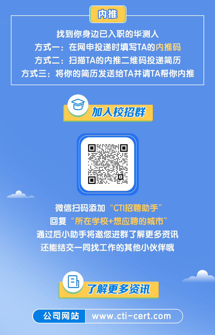 CTI华测检测成立于2003年,总部位于深圳,是中国检测认证行业首家上市公司(股票代码:300012)。作为中国第三方检测与认证服务的开拓者和领先者,CTI华测检测为全球客户提供一站式检验、测试、校准、认证及技术服务。以“为品质生活传递信任”为使命,CTI华测检测致力于在政府、企业和个人之间传递信任,全面保障品质与安全,推动合规与创新,彰显品牌竞争力,实现更高质量、更健康、更安全、更绿色的可持续发展。你的生活里,华测无处不在。