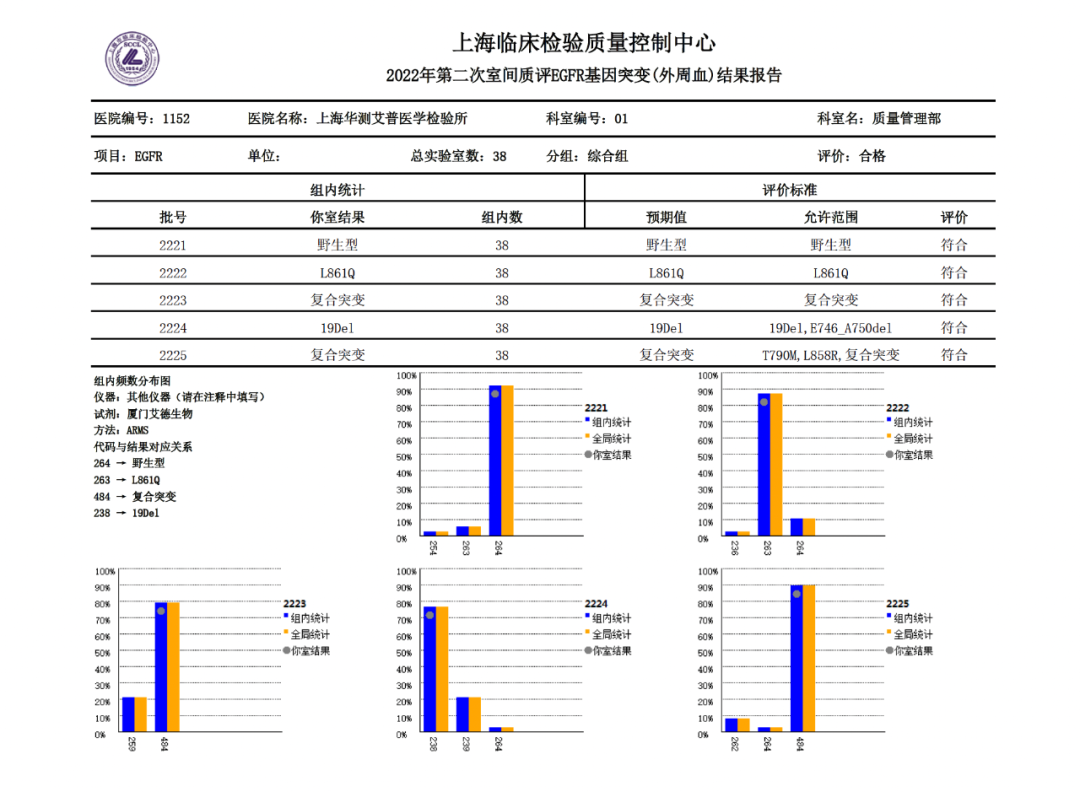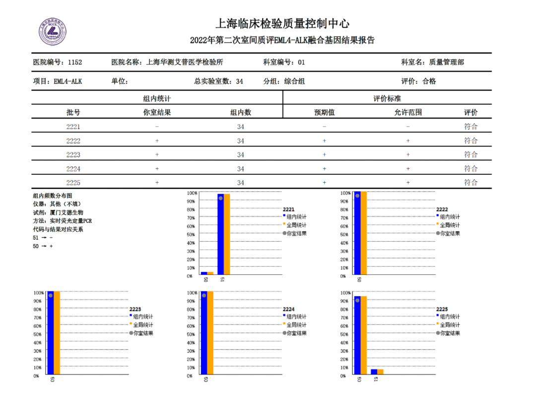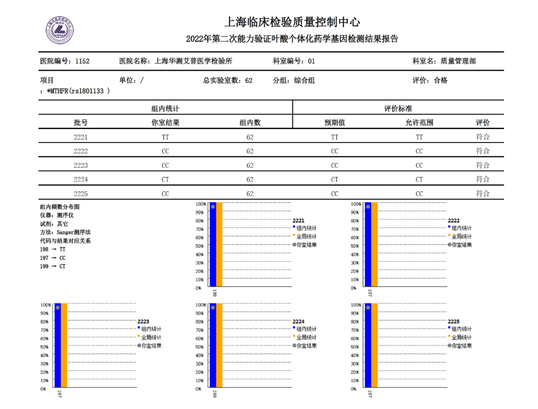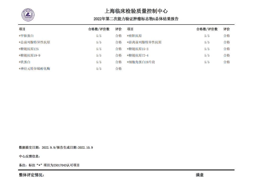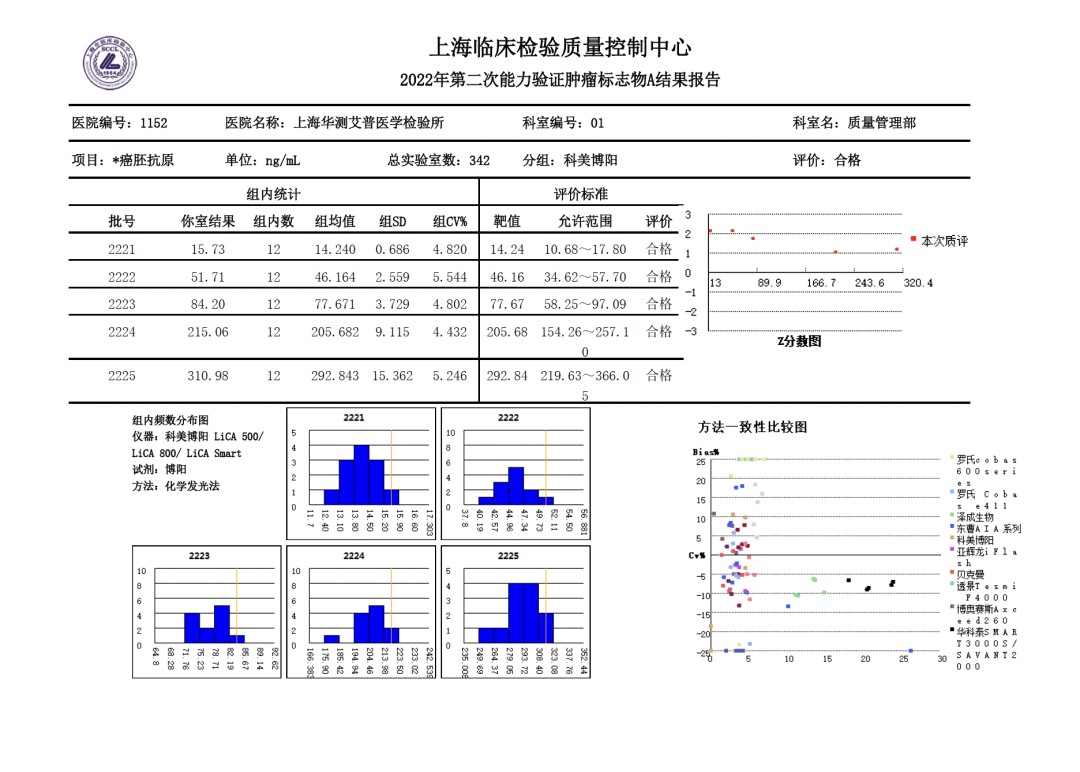 近日,上海市临床检验中心公布了2022年第二次室间质评结果,华测检测认证集团股份有限公司旗下——华测艾普医学实验室满分通过MSI、EGFR、ALK、KRAS、NRAS、ROS1、肿瘤标志物、同型半胱氨酸、脂类和流式细胞术淋巴细胞亚群等100余个项目!本次室间质评的优秀成绩,是华测艾普医学技术实力和高质量水平的充分体现,也充分展示了华测艾普医学在医学检测领域的先进技术、规范管理、严格质控、可靠结果!