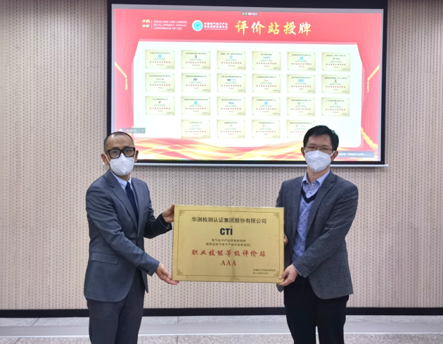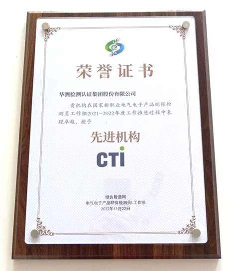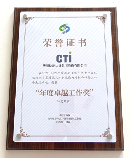 作为电气电子产品环保检测员工作组的副组长单位,CTI华测检测参与了电气电子产品环保检测员国家职业的技能标准讨论、培训教材开发、网络课程录制以及考评题库建设,为职业的发展贡献了自己的力量。2022年12月20日,CTI华测检测应邀参加了由中国电子节能技术协会参与主办的2022中国电气电子产业绿色低碳发展年会,由于CTI华测检测在该职业的职业建设以及考评工作中作出的突出贡献,职业工作组特别向华测检测颁发了“先进机构”、“卓越贡献奖”以及“先进个人”奖,并举行了华测检测评价站授牌仪式。