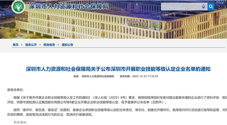 近日,深圳市人力资源和社会保障局在其官方网站发布了深圳市人力资源和社会保障局关于公布深圳市开展职业技能等级认定企业名单的通知。通知中称:根据《关于我市开展企业职业技能等级认定工作的通知》(深人社规〔2020〕8号)要求,我局按程序组织专家对提出备案申请的企业进行了资料评审、现场评估,同意华测检测认证集团股份有限公司等8家企业开展企业职业技能等级认定,现予备案并公布名单。