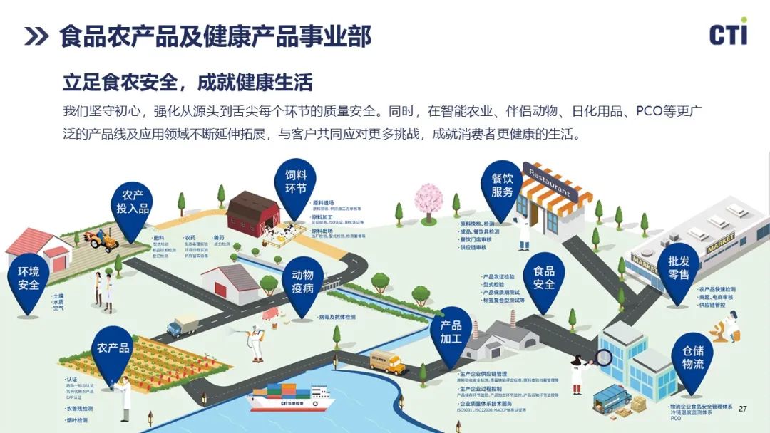 CTI华测食农及健康产品事业部为食品、农产品、特殊食品类企业提供一站式检测服务和解决方案,涵盖种植与养殖、初级生产、加工及包装、储藏运输、分销及零售、进出口等环节,保障从源头到消费者端全链路的质量安全。