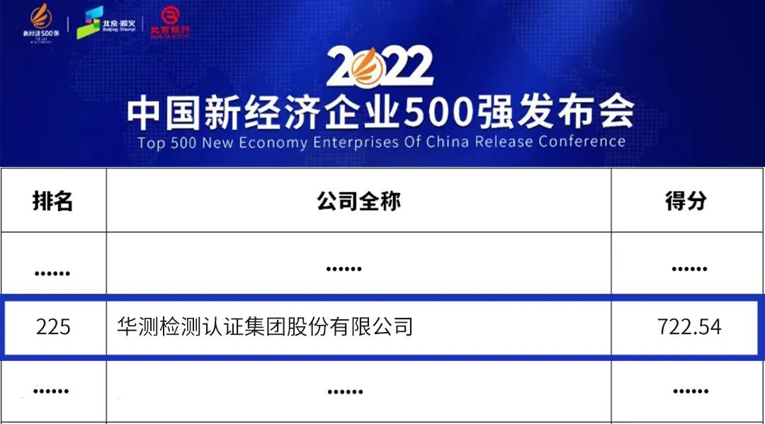 2023年3月30日,以“加快建设世界一流企业”为主题的2022中国新经济企业500强发布会在北京隆重举行。北京大学国家发展研究院特约研究员、中国新经济企业500强评审委员会联席主席许宪春在会上做新经济发展趋势展望,中国企业评价协会会长侯云春正式发布了2022中国新经济企业500强榜单,华测检测认证集团股份有限公司(简称CTI华测检测)凭借优异的表现连续三年上榜,以722.54分位列第225位。
