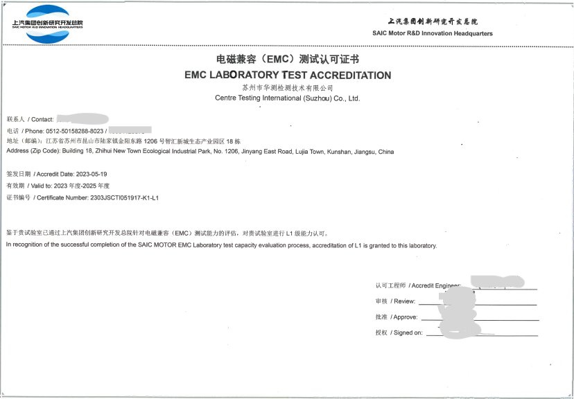 华测认证集团CTI智能交通电子产品线昆山实验室获上汽集团第三方实验室认可资质