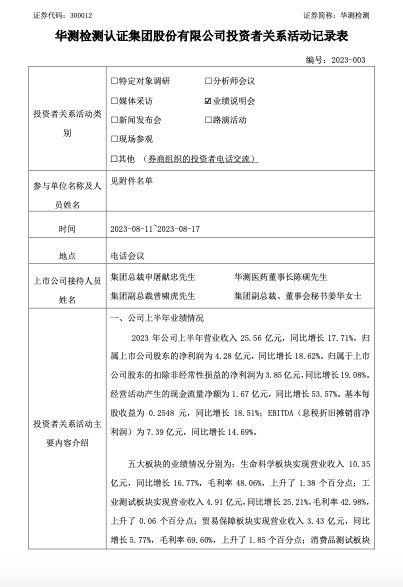 华测检测向投资者介绍了公司上半年业绩情况。2023年公司上半年营业收入25.56亿元,同比增长17.71%,归属上市公司股东的净利润为4.28亿元,同比增长18.62%。归属于上市公司股东的扣除非经常性损益的净利润为3.85亿元,同比增长19.08%。经营活动产生的现金流量净额为1.67亿元,同比增长53.57%。基本每股收益为0.2548元,同比增长18.51%;EBITDA(息税折旧摊销前净利润)为7.39亿元,同比增长14.69%。
