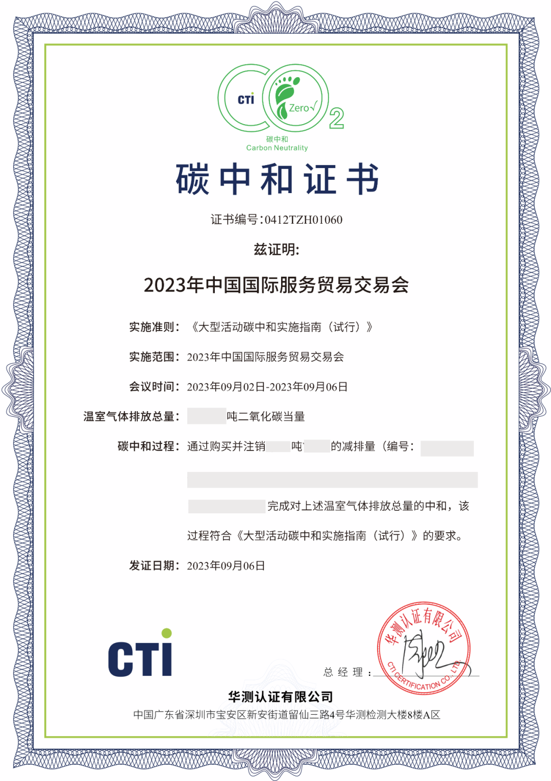 2023年9月6日,以“开放引领发展,合作共赢未来”为主题的2023年“中国国际服务贸易交易会”在北京圆满闭幕。CTI华测认证为此次服贸会颁发碳中和证书。