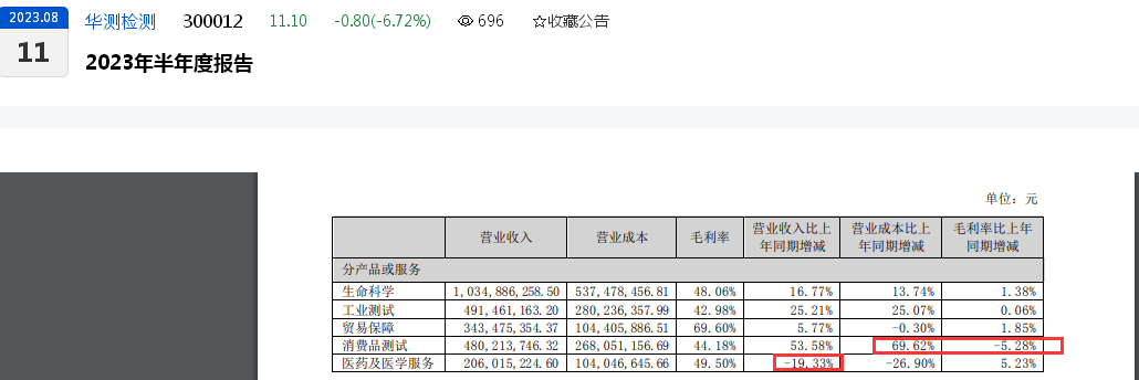 其中,2023年半年度,消费品测试的营收增长最为明显,不过报告期内,该业务板块的毛利率同比减少5.28%,也是唯一出现毛利率下滑的业务板块。