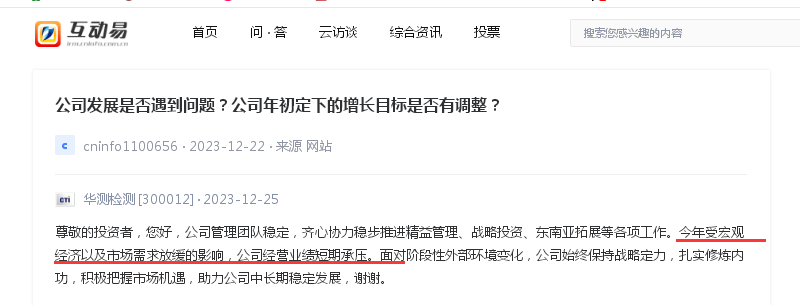 对于2023年度的整体业绩情况,华测检测亦曾回复投资者表示,今年受宏观经济以及市场需求放缓的影响,公司经营业绩短期承压。