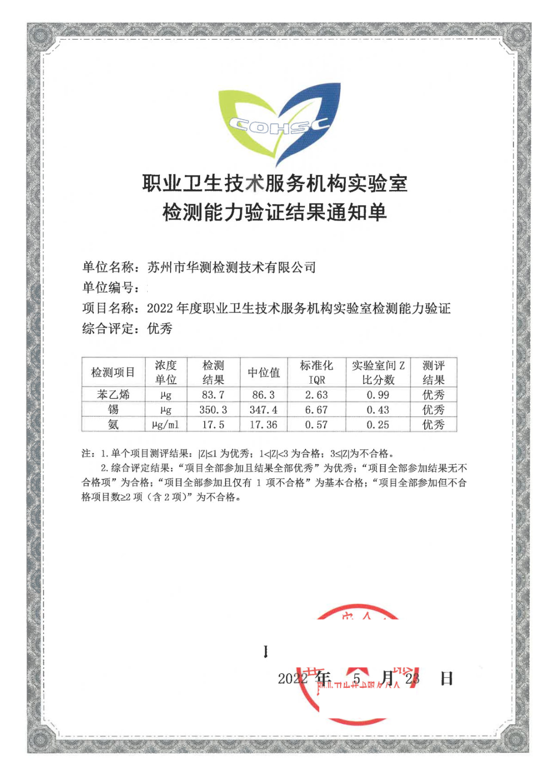 近日由江苏省疾病预防控制中心组织的“2023年度江苏省职业卫生实验室间比对”公布能力验证结果,华测检测认证集团股份有限公司(简称CTI华测检测)旗下子公司——苏州市华测检测技术有限公司参加了本次验证的全部考核项目,包含活性炭管中三氯乙烯、滤膜中镉、吸收液中氨和粉尘中游离二氧化硅,均取得满意结果,苏州市华测检测技术有限公司已连续3年顺利通过职业卫生专项能力验证。