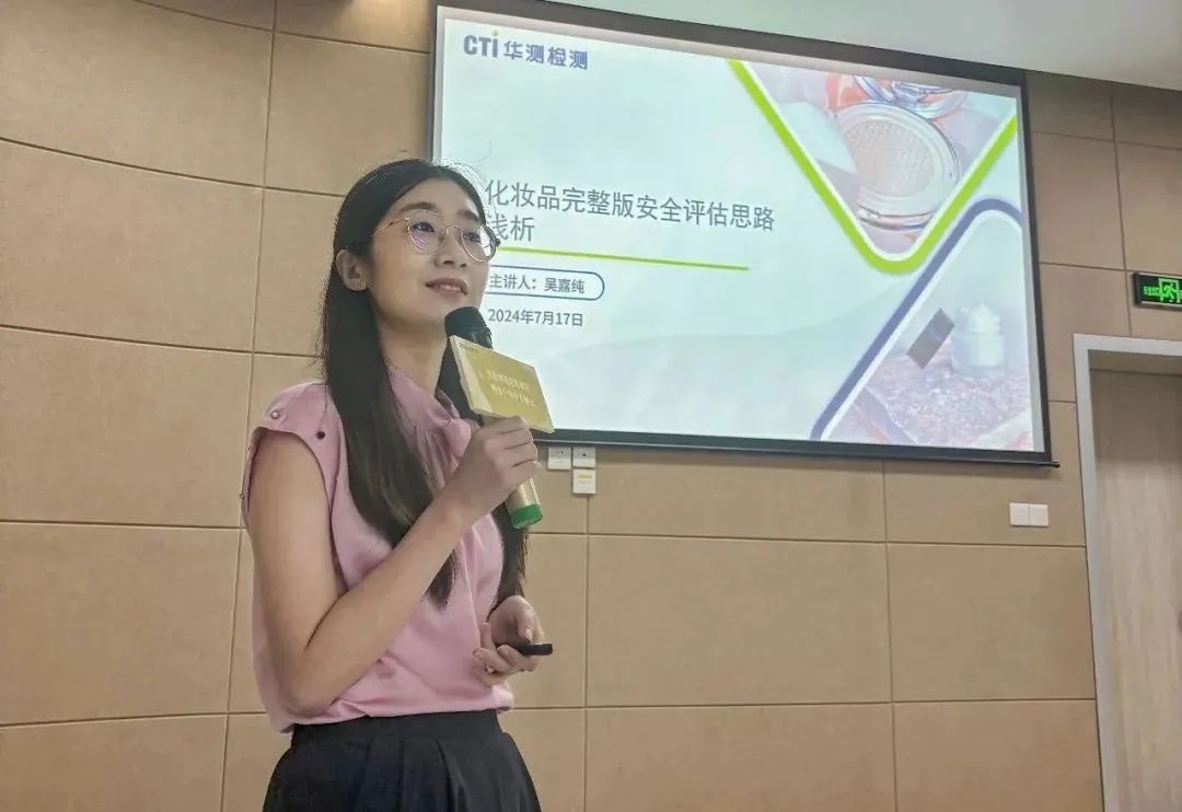 CTI华测检测化妆品法规负责人吴嘉纯以“化妆品完整版安全评估思路浅析”为主题针对化妆品安全评估现状作出专业分析,对安全评估资料提交的分类要求分别进行了介绍同时根据法规指出化妆品配方设计与原料使用的注意事项。